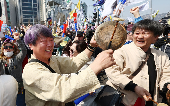 People seeking impeached President Yoon Suk Yeol's ouster are jubilant near the Constitutional Court in Seoul on April 4, 2025, after the court upheld the impeachment of Yoon, removing him from office over his short-lived imposition of martial law in December. (Yonhap)