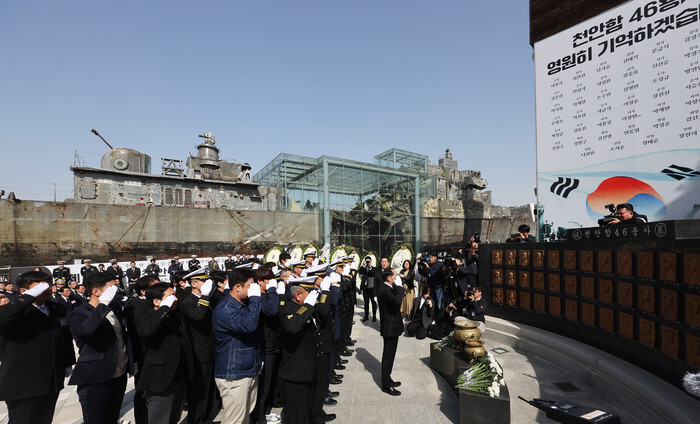 Sailors give a salute at the Second Fleet in Pyeongtaek, south of Seoul, on March 26, 2025, to pay tribute to 46 sailors who perished in North Korea's torpedo assault on the South Korean corvette Cheonan in 2010, during a memorial service marking the 15th anniversary of the incident. (Pool photo) (Yonhap)