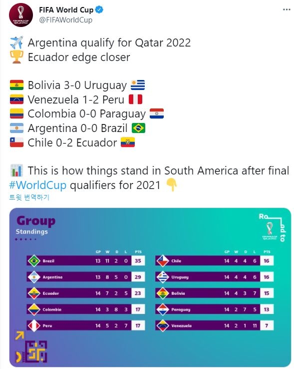 | ▲ 아르헨티나, 카타르 월드컵 본선 진출 [FIFA 월드컵 트위터 캡처. 재판매 및 DB 금지] |
