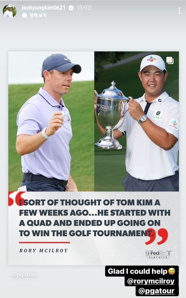 김주형 역시 자신의 소셜 미디어에 매킬로이의 발언을 올려놓고 '도울 수 있어서 기쁘다'라는 글을 게시했다.