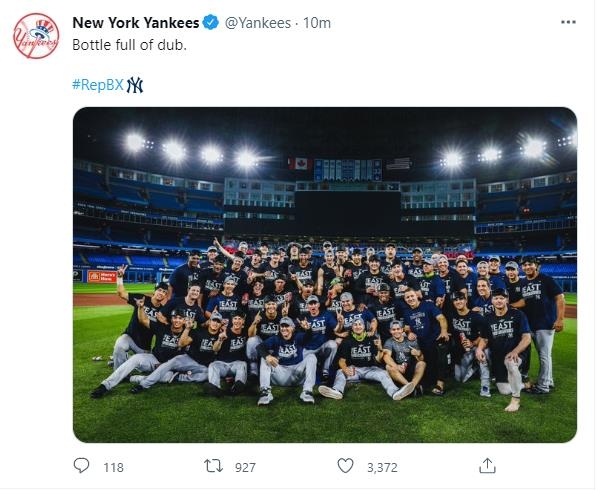 | ▲ 양키스, 3년 만에 AL 동부지구 우승 [뉴욕 양키스 트위터 캡처. 재판매 및 DB금지] |