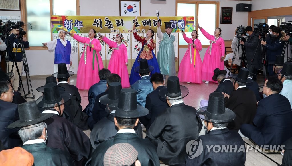 | ▲ 강릉 '위촌리 도배례' 3년 만에 재개 (강릉=연합뉴스) 유형재 기자 = 23일 강원 강릉시 성산면 위촌리 전통문화전승회관에서 마을주민 등 120여 명이 참석한 가운데 코로나19로 중단됐던 440년 넘는 전통의 합동 도배 행사인 '위촌리 도배례'가 3년 만에 열리고 있다. 주민들이 최종춘(96) 마을 촌장 등에게 세배하고 있다. 2023.1.23 yoo21@yna.co.kr |
