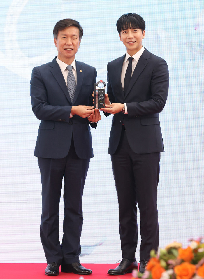 Actor Lee Seung-ki (R) poses for a photo with Kim Dae-ji, head of South Korea's National Tax Service, during a ceremony in Seoul on May 4, 2022, to mark his appointment as a promotional ambassador for the tax agency. (Yonhap)