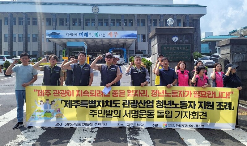 민주노총 서비스연맹 관광레저산업노동조합은 12일 제주도청 앞에서 기자회견을 열어 '제주도 관광산업 청년노동자 지원 조례' 주민발의를 위한 서명운동에 돌입한다고 밝혔다.