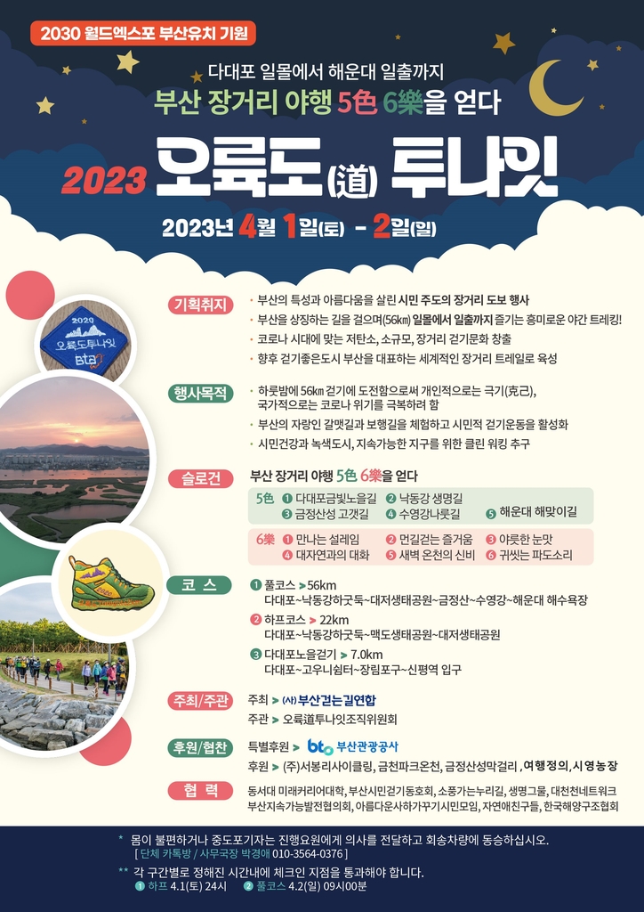 부산걷는길연합이 주최하는 이 행사는 부산시민걷기동호회 등 여러 시민사회 단체가 협력해 치르는 민간 주도의 걷기 축제로, 올해는 2030 세계박람회 부산 유치 기원하는 취지에서 부산관광공사가 특별 후원한다.
