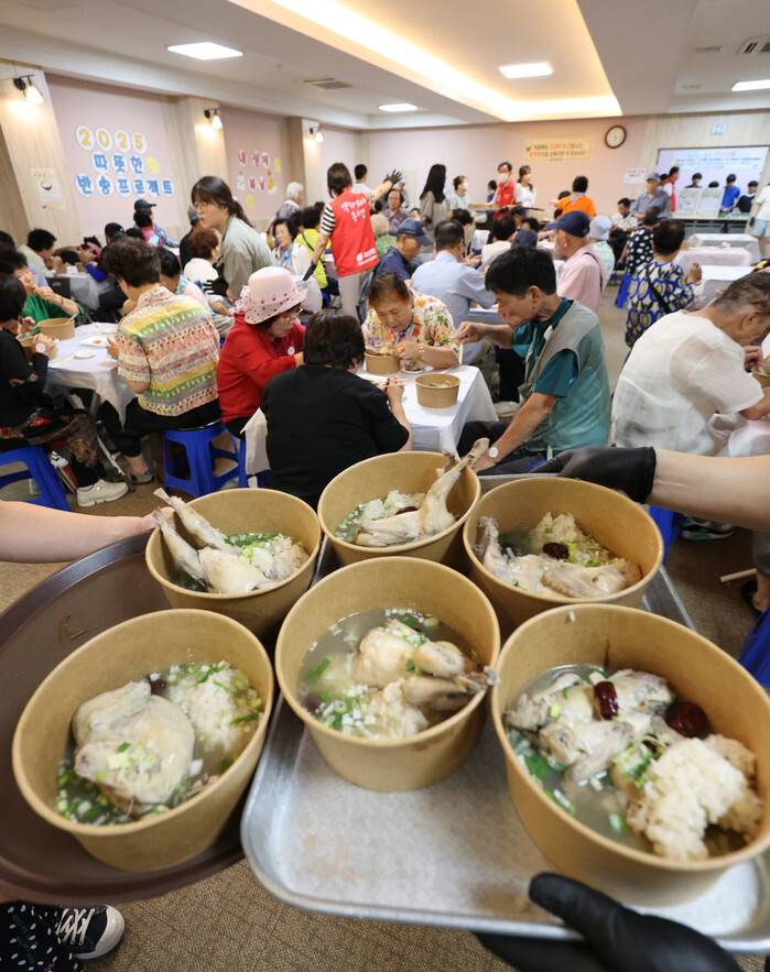 Volunteers serve "samgyetang," a soup of chicken and ginseng with sticky rice, during a charity event to treat senior citizens to the popular dish in the southeastern port city of Busan on July 30, 2025, this year's "jungbok," the day marking the middle of the hot season. Koreans traditionally eat samgyetang to replenish their strength during periods of hot weather that sap their energy. (Yonhap)