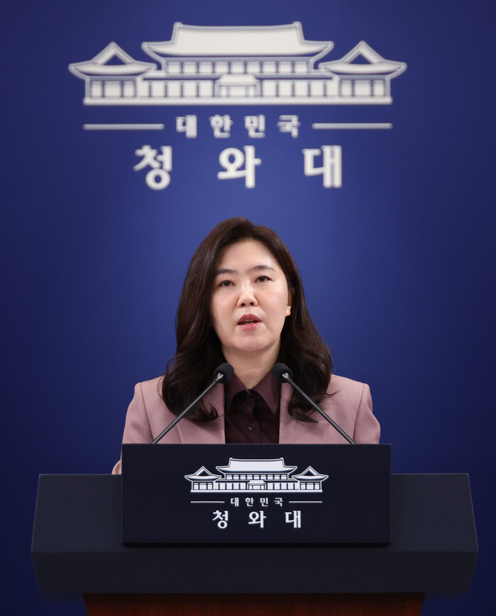 Presidential spokesperson Kang Yu-jung attends a press conference at the presidential office Cheong Wa Dae in Seoul on Jan. 12, 2026, to announce that a joint South Korean investigation team has nabbed 26 people over scam crimes involving sexual exploitation in Cambodia through cooperation with the local authorities. (Yonhap)