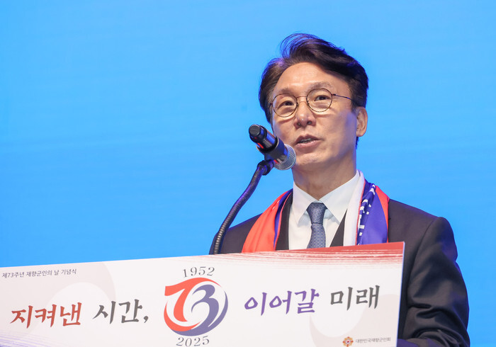 Prime Minister Kim Min-seok speaks during a ceremony at Olympic Park in Seoul on Sept. 24, 2025, to celebrate the 73rd anniversary of Veterans Day. (Yonhap)