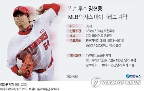 | ▲ [그래픽] 왼손 투수 양현종 MLB 텍사스 마이너리그 계약 (서울=연합뉴스) 장성구 기자 = 왼손 투수 양현종(33)이 꿈의 무대인 미국프로야구 메이저리그(MLB)에서 던질 기회를 마침내 잡았다. MLB 텍사스 레인저스 구단은 양현종, 포수 겸 1루수 존 힉스, 내야수 브록 홀트와 마이너리그 계약을 하고 이들을 스프링캠프에 초청한다고 13일(한국시간) 공식 발표했다. sunggu@yna.co.kr 페이스북 tuney.kr/LeYN1 트위터 @yonhap_graphics |