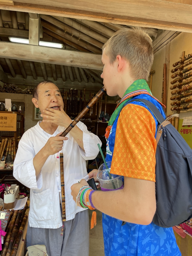 한국민속촌 인간문화재 동선본 선생이 네덜란드 스카우트 대원에게 단소 연주를 시연하느라 진땀을 빼고 있었다.