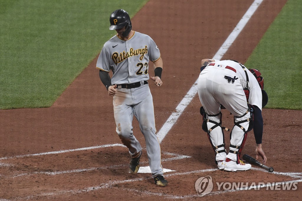 ▲ 홈을 밟는 케빈 뉴먼 (세인트루이스 AP=연합뉴스) 피츠버그 파이리츠 케빈 뉴먼이 26일(한국시간) 미국 미주리주 세인트루이스 부시 스타디움에서 열린 미국 메이저리그 세인트루이스 카디널스와의 방문경기, 3회초에 득점하고 있다.