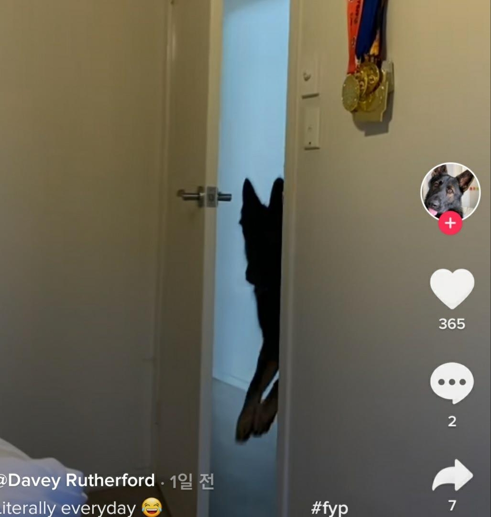 | ▲ 방문을 여는 단테 단테가 경찰견 출신답게 앞발로 점프하며 문을 강하게 밀치고 있다. 데이비 러더퍼드 틱톡 캡처. 재판매 및 DB 금지. |