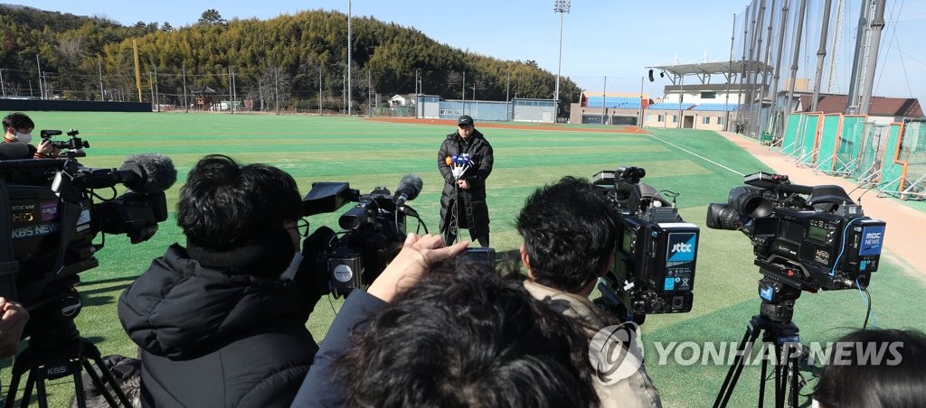 | ▲ 류현진 인터뷰 (거제=연합뉴스) 김동민 기자 = 류현진(35·토론토 블루제이스) 선수가 3일 오전 경남 거제시 하청스포츠타운에서 인터뷰하고 있다. 류현진 선수는 이날 친정 한화 이글스 스프링 캠프에서 훈련한다. 2022.2.3 image@yna.co.kr |