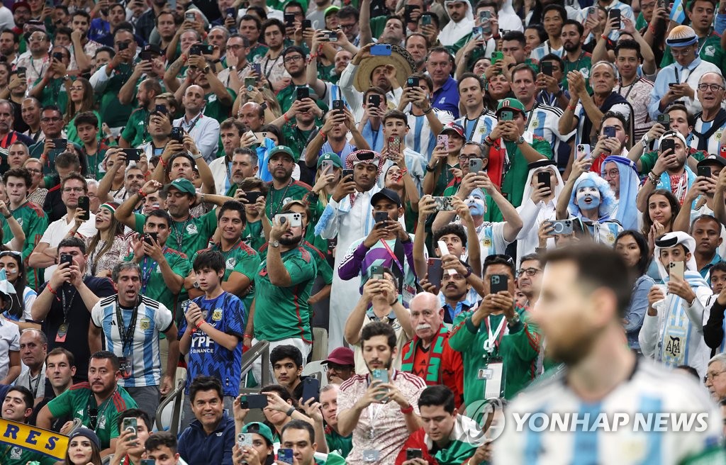 | ▲ 메시를 향한 시선 (루사일=연합뉴스) 임헌정 기자 = 27일 오전(한국시간) 카타르 루사일 스타디움에서 열린 2022 카타르 월드컵 조별리그 C조 2차전 아르헨티나와 멕시코 경기. 아르헨티나 리오넬 메시가 코너킥을 차려하자 관중이 휴대전화 카메라를 꺼내 사진을 찍고 있다. 2022.11.27 kane@yna.co.kr |