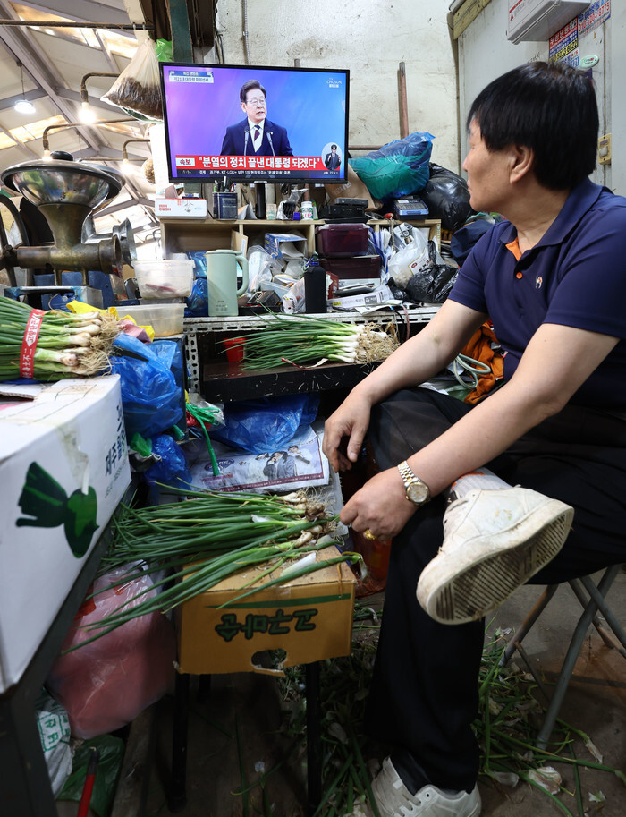 A shopkeeper watches a live TV report at a traditional market in Seoul on June 4, 2025, about newly elected President Lee Jae-myung's sworn-in ceremony at the National Assembly. (Yonhap)