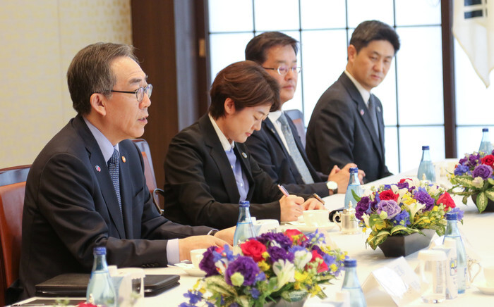 South Korean Foreign Minister Cho Tae-yul (far L) holds talks with Japanese Foreign Minister Takeshi Iwaya (not pictured) during their meeting at the foreign ministry's Iikura guesthouse in Tokyo on March 22, 2025. (Yonhap)