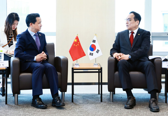 South Korean Trade Minister Cheong In-kyo (R) talks with Chinese Ambassador to South Korea Dai Bing during their meeting in Seoul on May 21, 2025, in this photo provided by the ministry. (PHOTO NOT FOR SALE) (Yonhap)