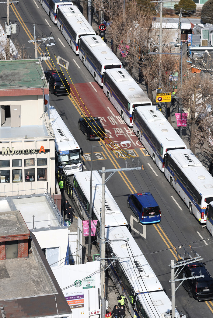 A Ministry of Justice vehicle (blue) carrying arrested President Yoon Suk Yeol is en route to the Constitutional Court in Seoul on Feb. 18, 2025, as Yoon will attend the ninth hearing of his impeachment trial for his short-lived imposition of martial law in December. (Yonhap)