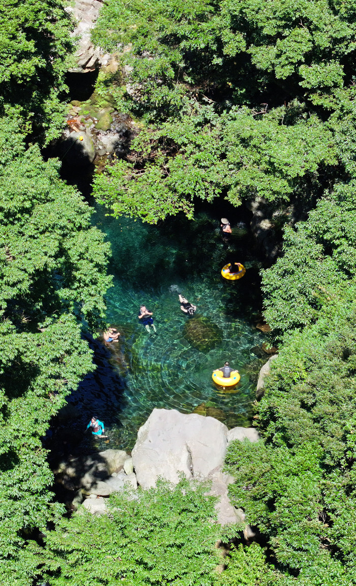 People cool down in a valley at Donnaeko Resort in Seogwipo on South Korea's largest island of Jeju on July 28, 2025, as a heat wave hit the region. (Yonhap)