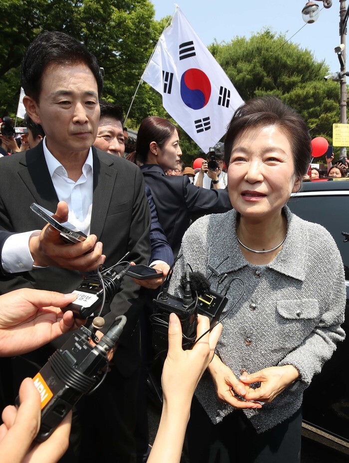 Former President Park Geun-hye (R) speaks to reporters as she visits the birthplace of her father and late President Park Chung-hee in Gumi, North Gyeongsang Province, southeastern South Korea, on May 27, 2025. (Yonhap)