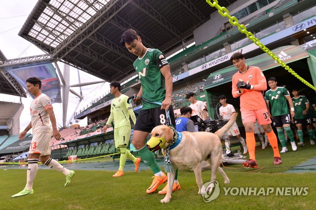 | ▲ 현대차, 반려견 헌혈 문화 조성 'K리그 동반 입장' 이벤트 진행 (서울=연합뉴스) 현대자동차가 지난 30일 반려견 헌혈 문화 조성을 위한 K리그 동반 입장 이벤트를 진행했다고 31일 밝혔다. 사진은 경기 전 선수들이 헌혈견과 함께 입장하는 모습. 2022.7.31 [현대차 제공. 재판매 및 DB 금지] photo@yna.co.kr |