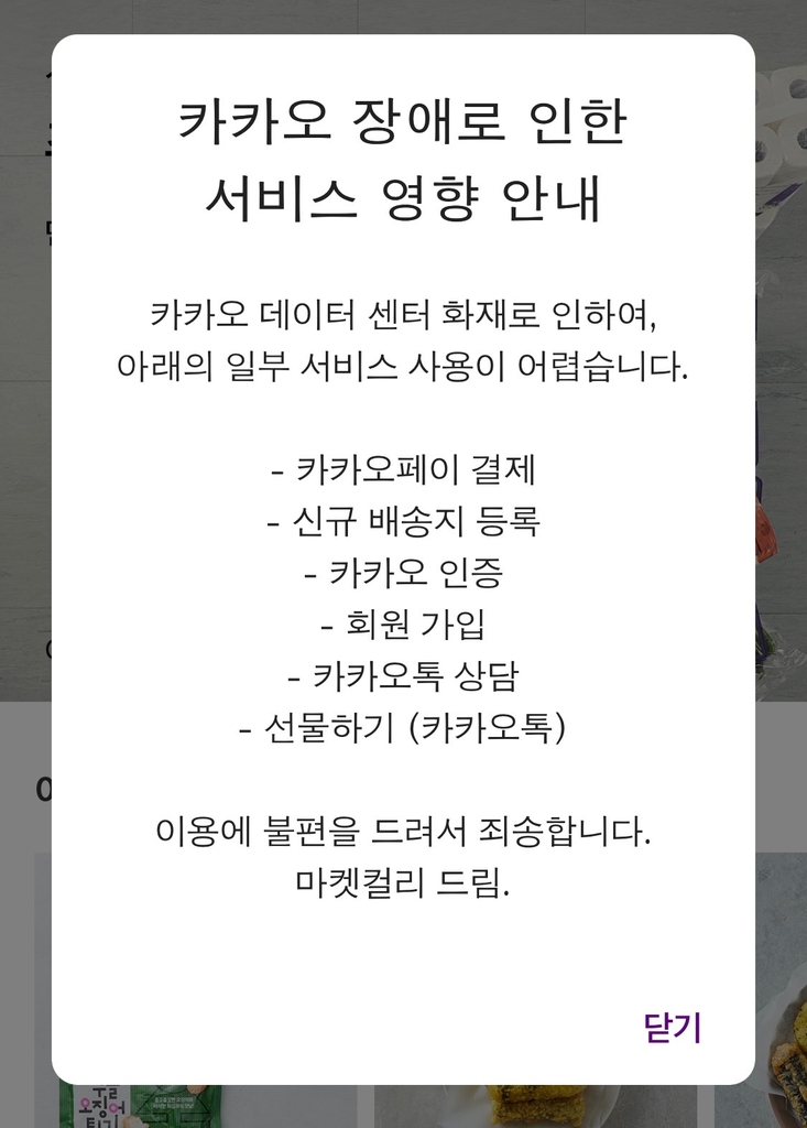 마켓컬리는 전날 홈페이지와 앱에 카카오페이 결제, 카카오톡 선물하기 등 일부 서비스 사용이 어렵다고 게시했다.