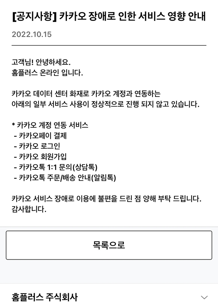 홈플러스는 전날 온라인 홈페이지와 모바일 앱에 "카카오 계정 연동 서비스인 카카오페이 결제, 카카오 로그인, 카카오 회원가입, 카카오 1:1 문의, 카카오톡 주문/배송 안내 등이 정상적으로 진행되지 않는다"고 공지했다.