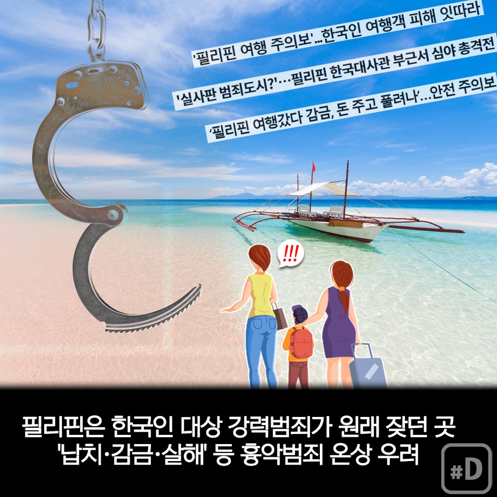 사실 필리핀에서 한국인이 희생된 것은 한두 번이 아닙니다. 코로나 팬데믹 이전에는 적잖은 한인이 필리핀에서 납치 살해당했습니다. 최근엔 필리핀 남부에서 이슬람 무장세력 2명이 외국인 4명을 납치 살해해 충격을 줬습니다. 치안이 나빠진 해외 여행지가 많습니다.