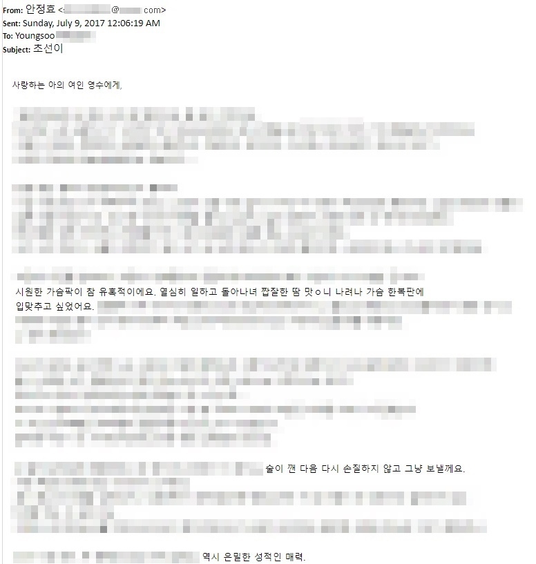 안씨는 2017년 5월 말부터 이메일을 통해 본격적으로 사적인 감정을 드러내기 시작했고, 여러 번 완곡한 거절에도 '사랑 고백'이 이어졌다고 정씨는 전했다.