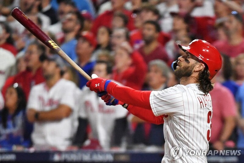 안타 2개로 이어간 2사 1, 3루에서 브라이스 하퍼가 짜릿한 역전 우월 3점포를 쏘아 올렸다.