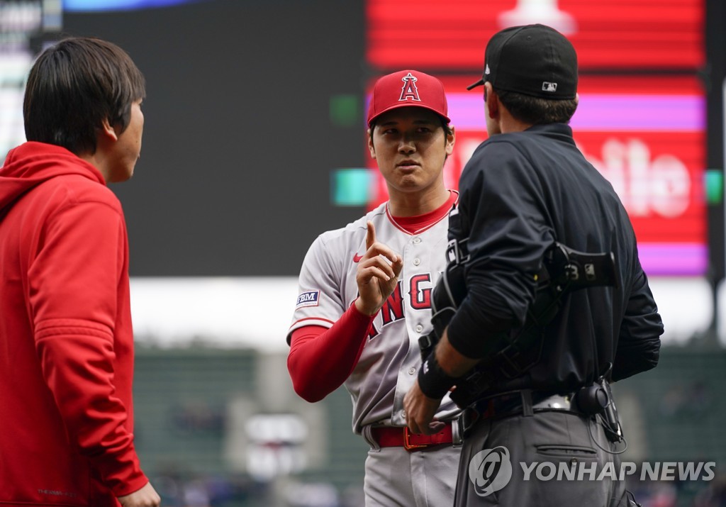 | ▲ 투수로 피치 클록 어겨 볼 1개를 손해 본 뒤 심판과 얘기하는 오타니 [AP=연합뉴스] |