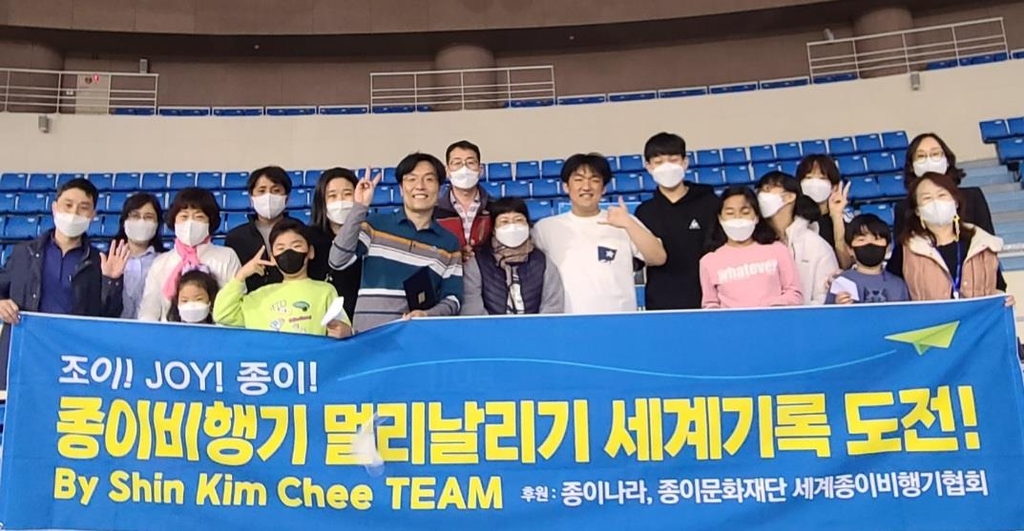 | ▲ 종이비행기 멀리 날리기 세계기록 도전 후 기념촬영한 모습 [종이문화재단 제공] |