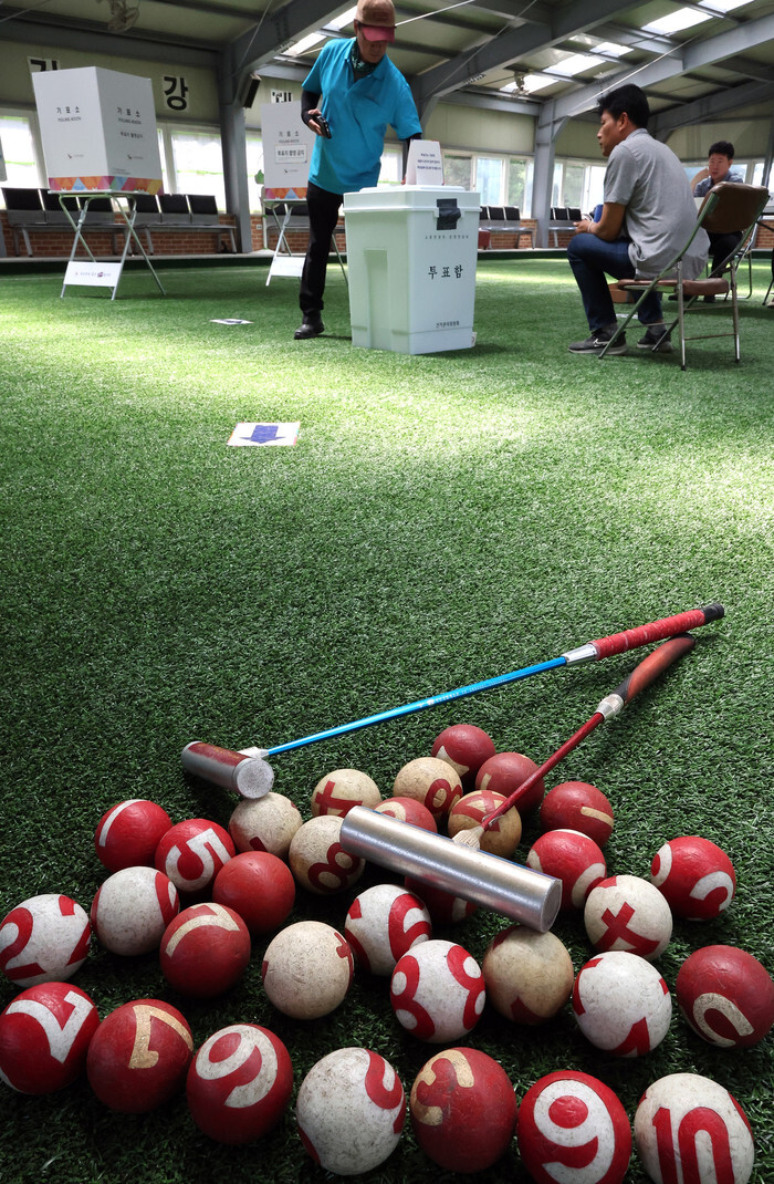 A voter casts his ballot at a polling station in an indoor gateball court in Sejong, central South Korea, on June 3, 2025, in the South Korean presidential election. (Yonhap)