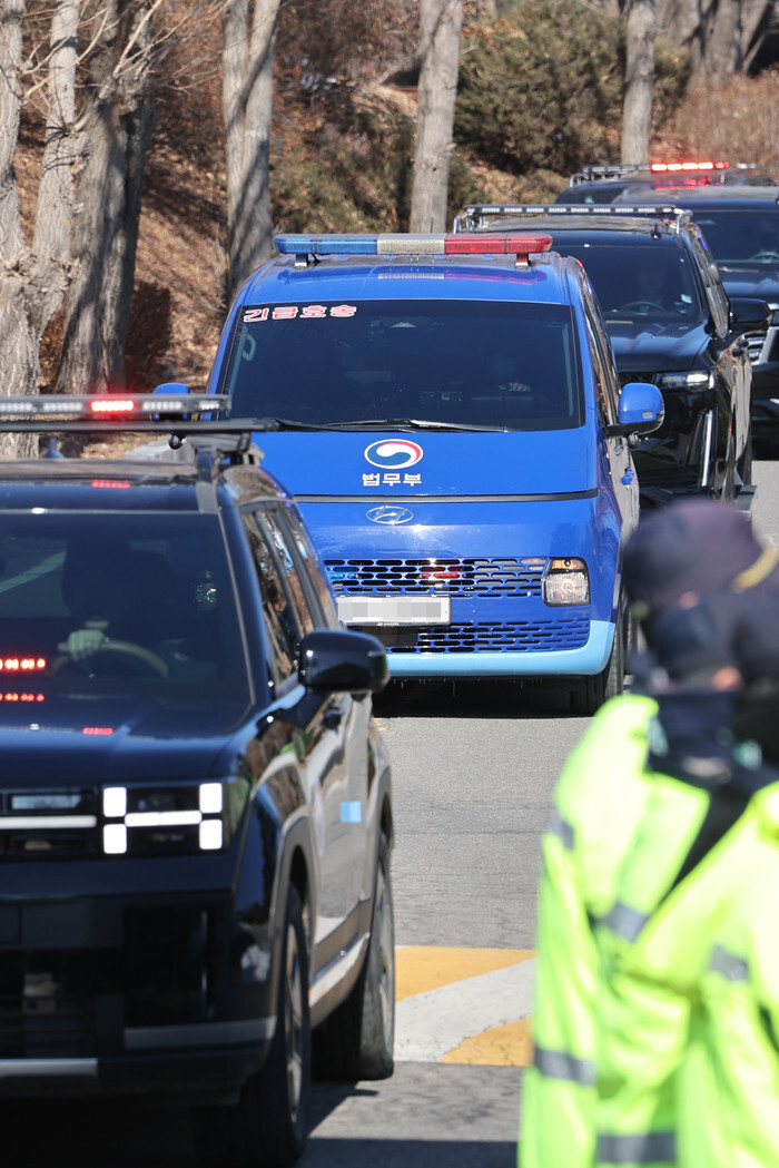 A justice ministry vehicle (C, blue) carrying arrested President Yoon Suk Yeol leaves the Seoul Detention Center in Uiwang, south of Seoul, on Feb. 4, 2025, en route to the Constitutional Court in the capital, as Yoon will attend the fifth hearing of his impeachment trial in connection to his short-lived imposition of martial law in December. (Yonhap)