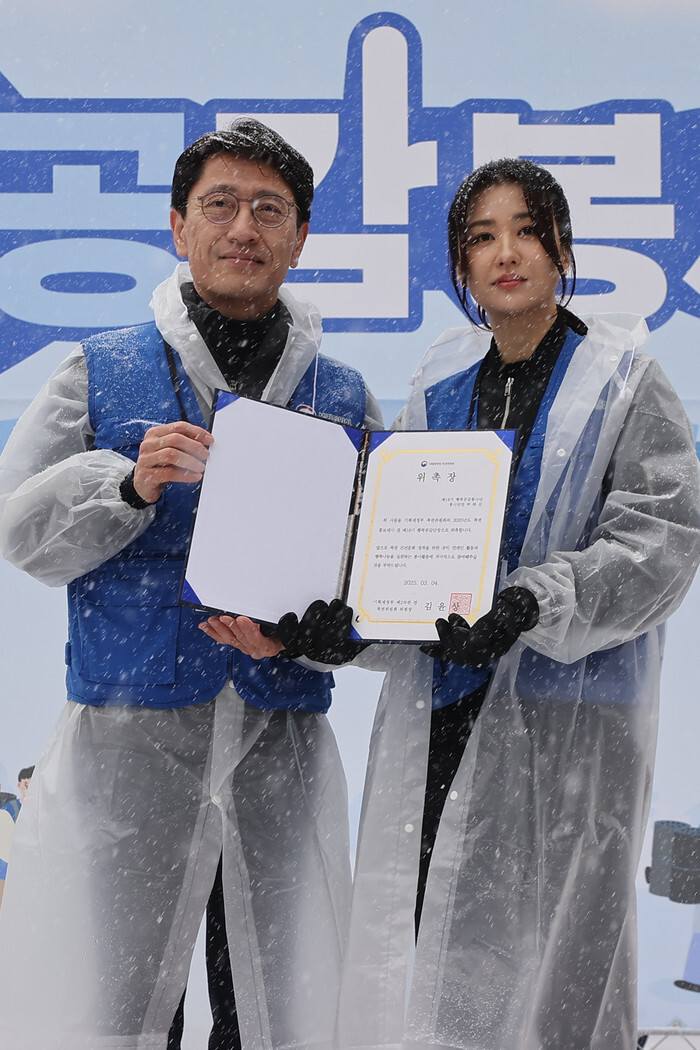 Actress Park Ha-sun (R) poses for a photo with Second Vice Finance Minister Kim Yoon-sang in a village in Seoul on March 4, 2025, after being appointed as a promotional ambassador for a volunteer group of the Korea Lottery Commission affiliated with the finance ministry. (Yonhap)