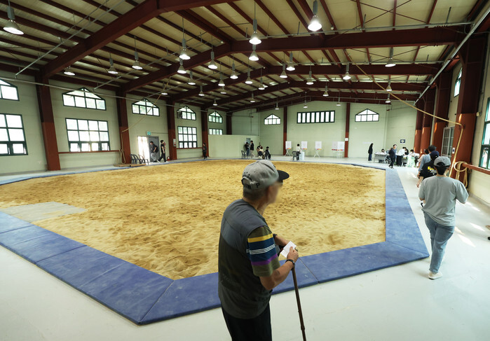 People vote at a polling station in a stable of traditional Korean wrestling known as "ssireum" in Seongnam, south of Seoul, on June 3, 2025, in the South Korean presidential election. (Yonhap)