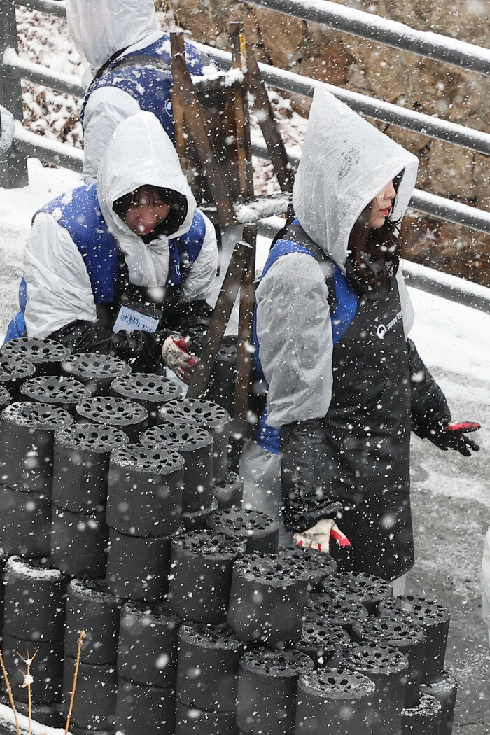 A volunteer group, launched by the Korea Lottery Commission and affiliated with the finance ministry, distributes coal briquettes as part of a charity event to assist impoverished local residents in a village in Seoul on March 4, 2025. Briquettes are still used for cooking and heating in old Korean homes. (Yonhap)