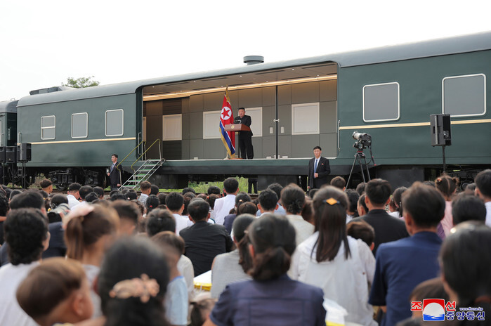 North Korean leader Kim Jong-un announces measures to support flood victims during his visit to a temporary shelter in Uiju County in North Pyongan Province in this photo released by the state-run Korean Central News Agency on Aug. 10, 2024. (For Use Only in the Republic of Korea. No Redistribution) (Yonhap)