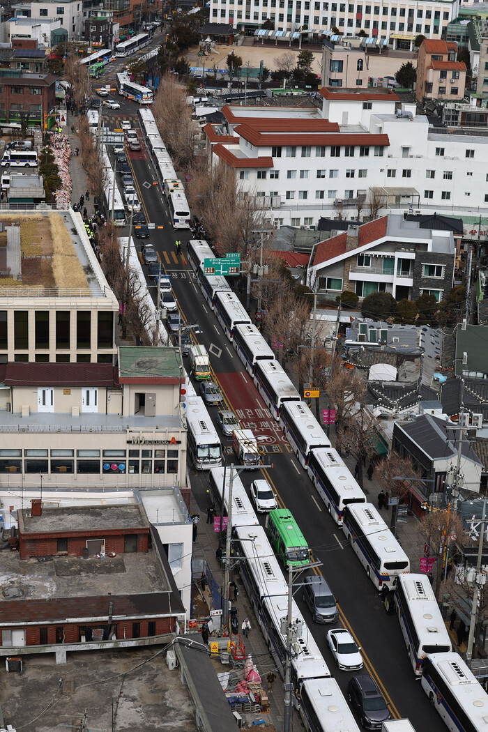 Barricades of police buses are seen on a road near the Constitutional Court in Seoul on Feb. 25, 2025, as the court is set to hold the 11th and final hearing of detained President Yoon Suk Yeol's impeachment trial in connection with his short-lived imposition of martial law in December. (Yonhap)