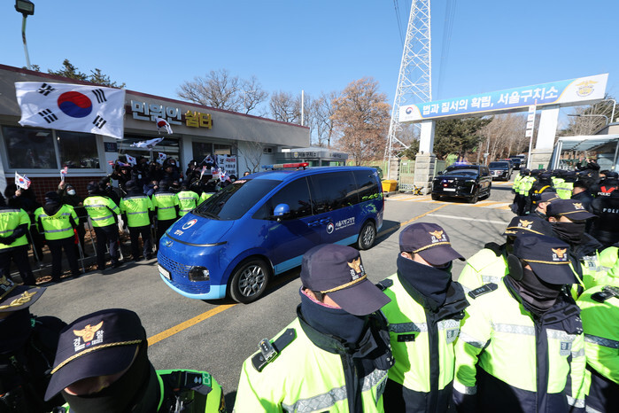 A justice ministry vehicle carrying arrested President Yoon Suk Yeol leaves the Seoul Detention Center in Uiwang, south of Seoul, on Feb. 4, 2025, en route to the Constitutional Court in the capital, as Yoon will attend the fifth hearing of his impeachment trial in connection to his short-lived imposition of martial law in December. (Yonhap)