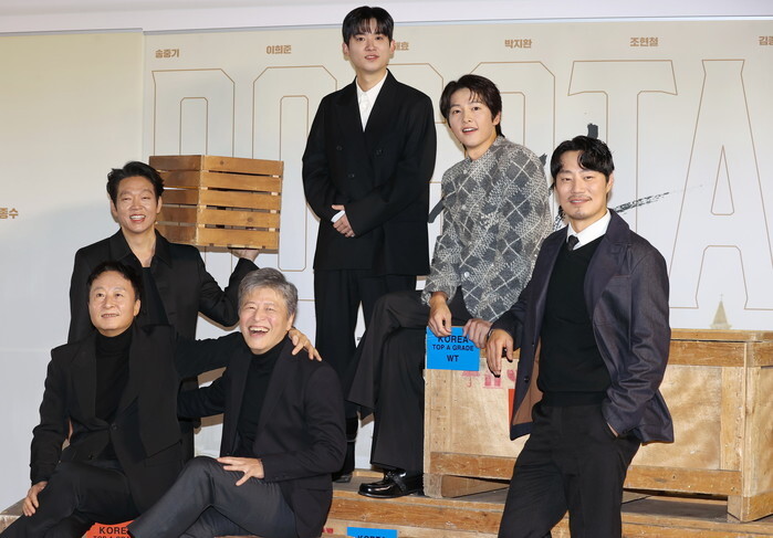 The stars of the new movie "Bogota: City of the Lost" -- Kim Jong-soo, Park Ji-hwan, Kwon Hae-hyo, Cho Hyun-chul, Song Joong-ki and Lee Hee-jun (L to R) -- pose for a photo during an event in Seoul on Dec. 6, 2024, to promote the movie, set to hit local screens in South Korea on Dec. 31. (Yonhap)