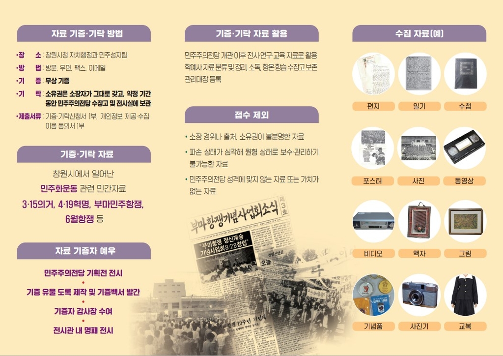 창원시 관계자는 "창원지역에서 발생한 3·15 의거, 4·19 혁명, 부마민주항쟁, 6·10 항쟁 등 민주화운동 관련 역사적 사건과 연관된 자료를 보관하고 있는 개인 또는 단체로부터 기증·기탁 신청을 받는다"며 "수집된 자료는 민주주의전당 전시관이나 수장고에 소장해 연구자료로 활용할 예정"이라고 말했다.
