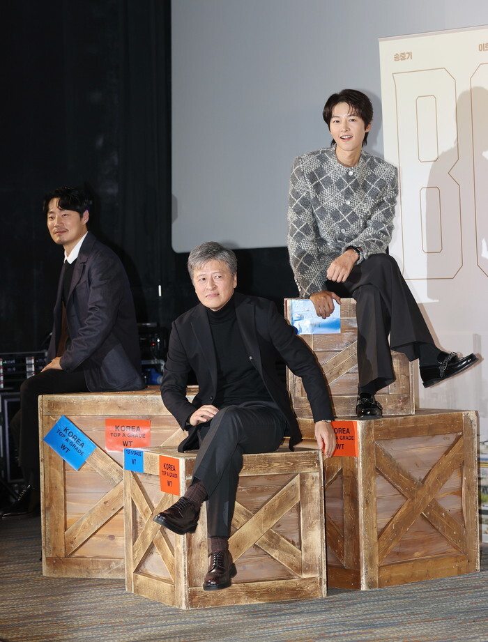 The stars of the new movie "Bogota: City of the Lost" -- Lee Hee-jun, Kwon Hae-hyo and Song Joong-ki (L to R) -- pose for a photo during an event in Seoul on Dec. 6, 2024, to promote the movie, set to hit local screens in South Korea on Dec. 31. (Yonhap)