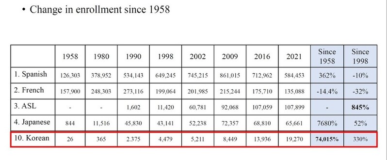 미국 하와이대 마노아캠퍼스 한국어학과 정한별 교수는 지난 15일 개최된 '한국어 교육과 K 콘텐츠 세미나'에서 1958년부터 2021년까지 미국 내 한국어 수업 누적 수강생은 7만4천15%(1만9천270명) 증가했다고 소개하기도 했다.