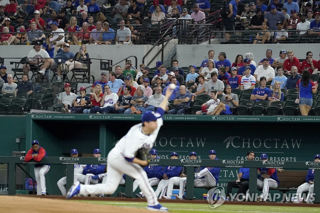 | ▲ 관중 앞에서 투구하는 양현종 (알링턴 AP=연합뉴스) 텍사스 레인저스 왼손 투수 양현종이 20일(한국시간) 미국 텍사스주 알링턴의 글로브라이프필드에서 열린 미국 메이저리그 뉴욕 양키스와의 홈경기에 선발 등판해 역투하고 있다. |