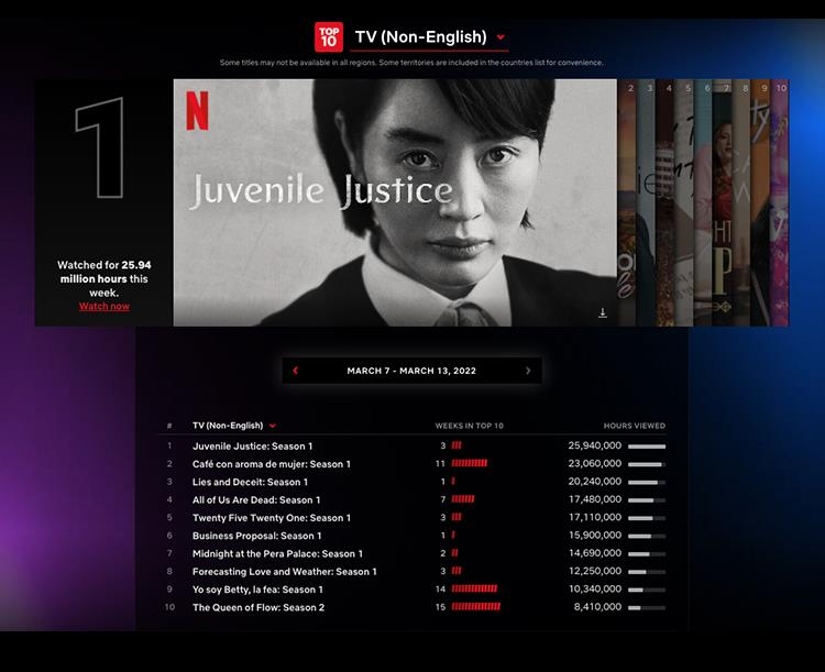 16일 넷플릭스 시청 시간을 공개하는 공식 사이트 '넷플릭스 톱(TOP) 10'에 따르면 '소년심판'은 3월 둘째 주(7∼13일) 시청 시간 2천594만 시간을 기록해 비영어권 드라마 부문 정상에 올랐다.