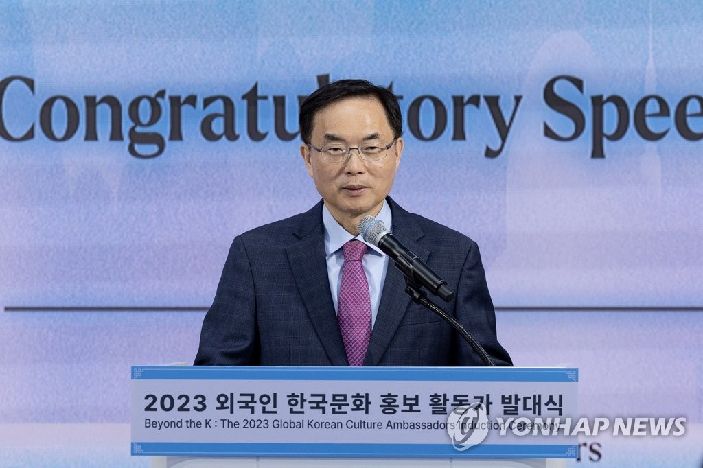 | ▲ 축사하는 조용만 2차관 (서울=연합뉴스) 조용만 문화체육관광부 2차관이 19일 서울 중구 코시스센터 다목적홀에서 열린 '2023 외국인 한국문화 홍보 활동가 발대식'에서 축사하고 있다. 2023.5.19 [문화체육관광부 해외문화홍보원 제공. 재판매 및 DB 금지] photo@yna.co.kr |