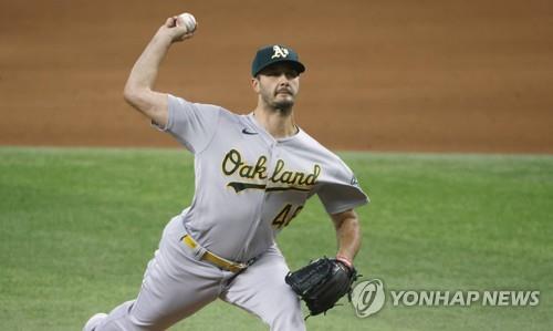 | ▲ In this Getty Images file photo from Aug. 15, 2021, Burch Smith of the Oakland Athletics pitches against the Texas Rangers during the bottom of the sixth inning of a Major League Baseball regular season game at Globe Life Field in Arlington, Texas. (Yonhap) |