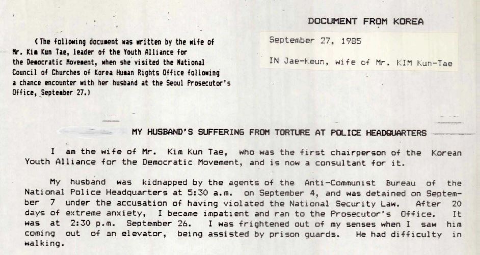 도서관이 공개한 서류 상단 우측에는 '1985년 9월 27일, 김근태의 아내 인재근이 한국에서 보내는 서류'라고 적혀 있다. 제목은 '우리 남편이 경찰 수뇌부에서 당한 고문의 고통'이다.