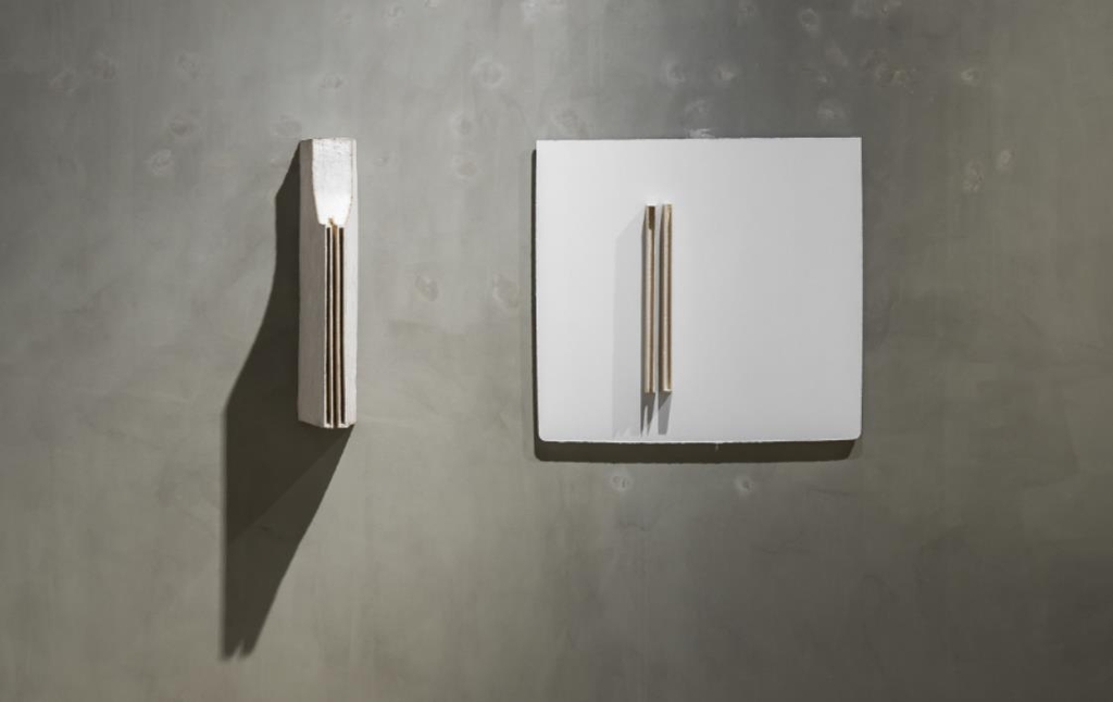 작가는 나무를 가늘고 길게 파내 그림자가 드리워진 어둠의 공간을 새겨 넣은 작품들을 선보인다.